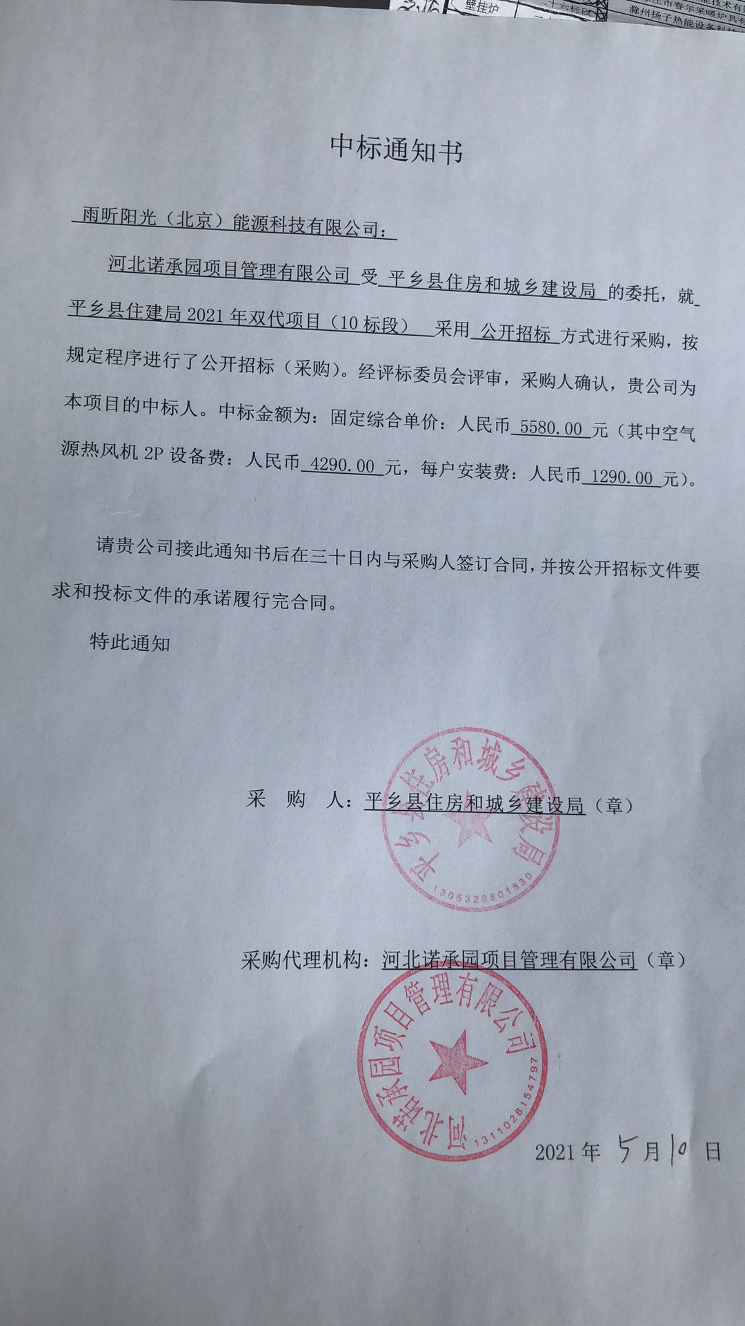 祝賀雨昕陽(yáng)光中標(biāo)河北平鄉(xiāng)縣住建局2021年雙代項(xiàng)目