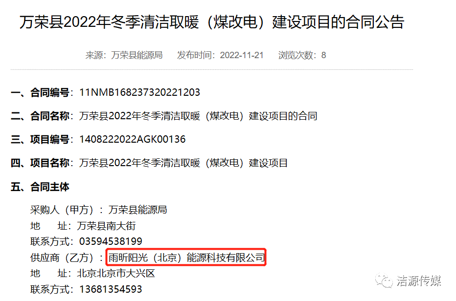 雨昕陽光中標萬榮縣2022年冬季清潔取暖(煤改電)建設項目