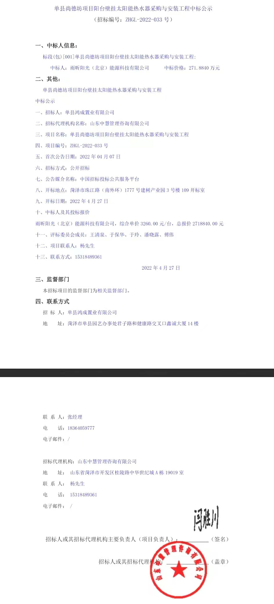 祝賀雨昕陽光中標(biāo)單縣尚德坊太陽能熱水器采購與安裝工程