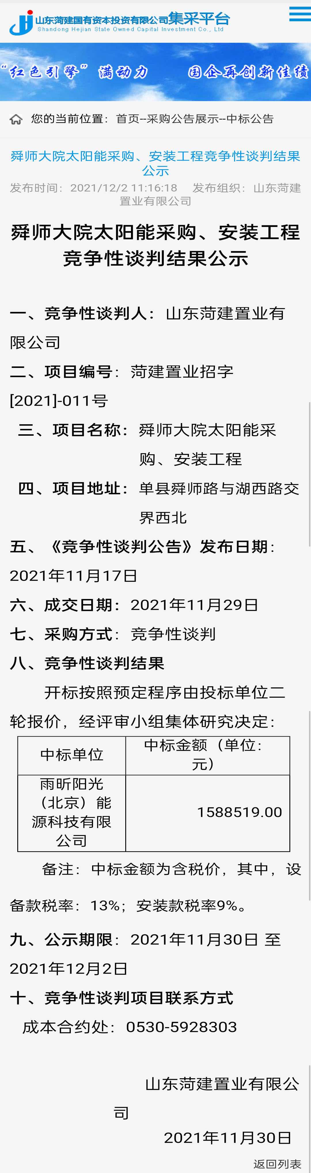 雨昕陽(yáng)光中標(biāo)單縣舜師大院太陽(yáng)能采購(gòu)、安裝工程
