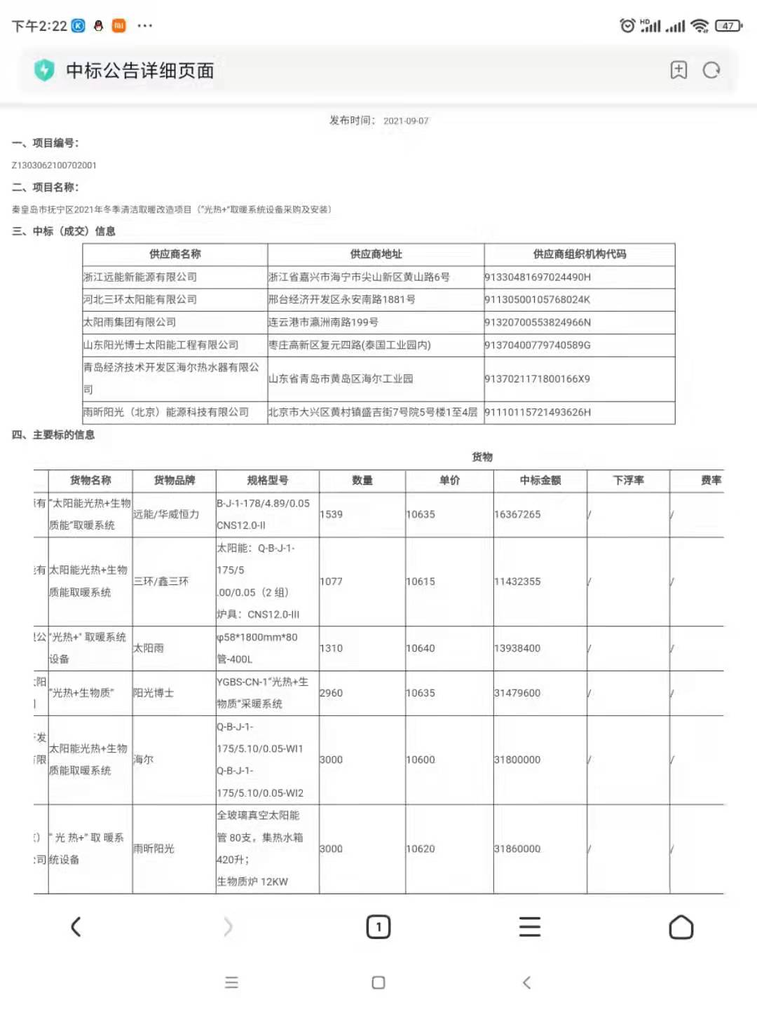 雨昕陽光(北京)能源科技有限公司,成功中標(biāo)秦皇島市撫寧區(qū)2021年冬季清潔取暖改造項(xiàng)目,項(xiàng)目金額3186萬元,助力國家碳中和、碳達(dá)峰早日實(shí)現(xiàn),雨昕陽光在行動(dòng)。