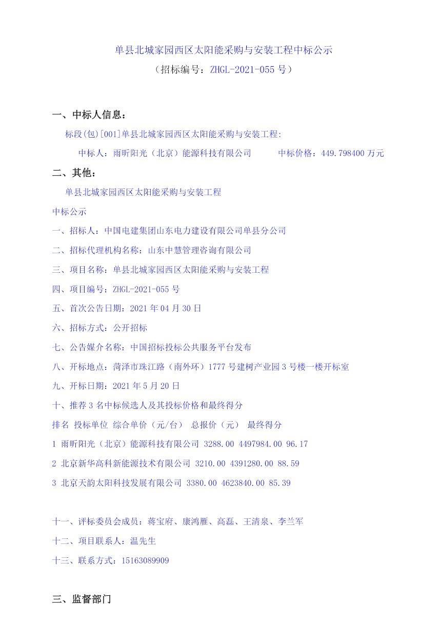 雨昕陽光中標(biāo)單縣北城家園西區(qū)太陽能供貨與安裝工程