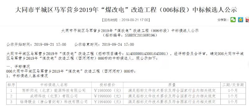 近幾年,越來越多的地區(qū)開展了煤改清潔能源行動,近日,山西省大同市平城區(qū)馬軍營鄉(xiāng)2019年“煤改電”改造工程開標,雨昕陽光再次成功中標。這是雨昕陽光公司近幾年相繼中標北京、天津、河北、山東等省份煤改電項目后,再次中標山西省煤改電項目,該項目類型為分散蓄熱式電采暖器系統(tǒng),公司已做好充分準備,將全力以赴為山西“煤改電”項目貢獻自己的一份力量,為廣大民眾帶去了溫暖舒適的冬季采暖服務(wù)。