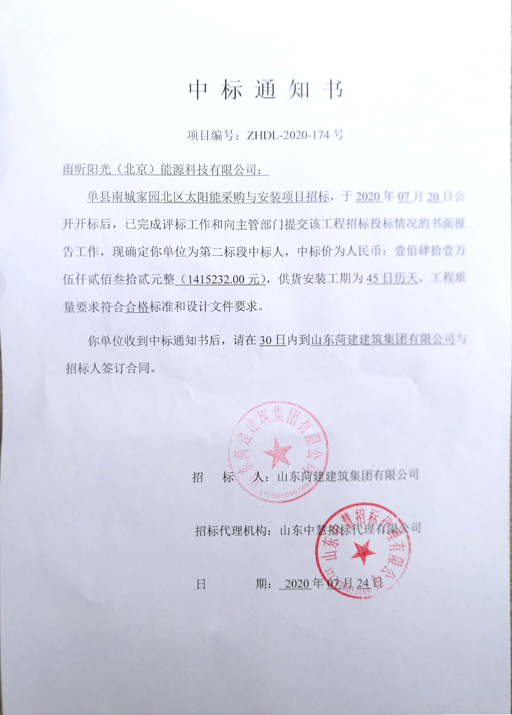 祝賀雨昕陽光中標(biāo)單縣南城家園北區(qū)太陽能項(xiàng)目